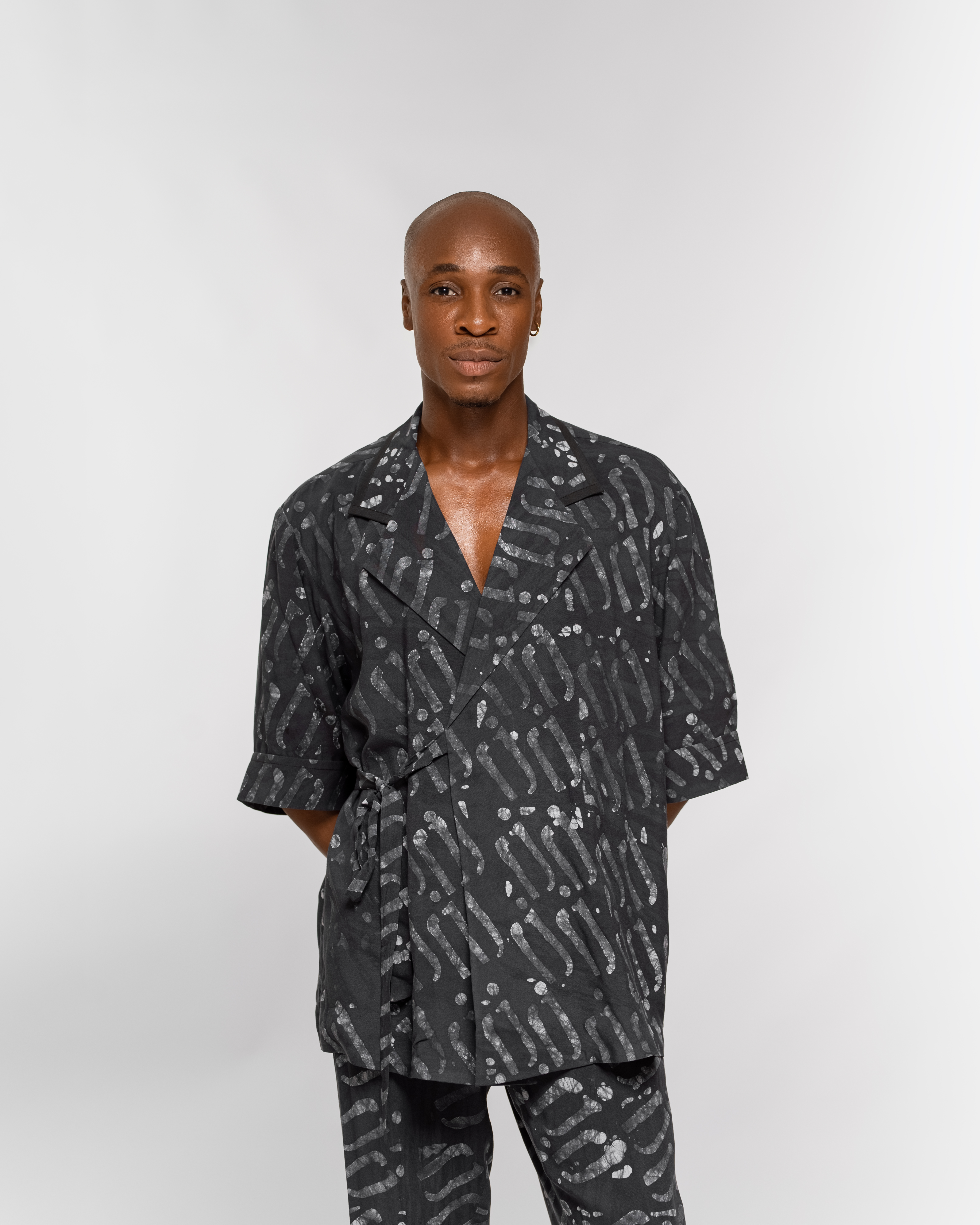 Ensemble fluide composé d’une chemise à manches courtes et d’un pantalon assorti, réalisé dans un tissu léger imprimé du logo Jacques Logoh Couture. Une silhouette moderne, élégante et confortable.